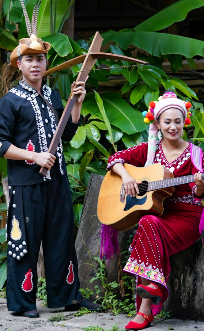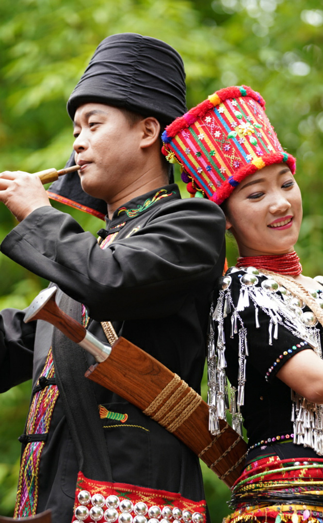德昂族人口約1.7萬,主要分布在德宏州和保山市的潞西、梁河、瑞麗、隴川、隆陽(yáng)等縣區(qū)。民居多為草排覆頂竹木結(jié)構(gòu)的干欄式建筑,眼前的德昂村建筑納入了能容納數(shù)十人居住的德昂大房子,氈帽頂?shù)男》孔樱€有頗具浪漫色彩的大公房、小公房……還建有“龍陽(yáng)塔”標(biāo)志及佛教奘房、佛塔。德昂族民間普遍信奉南傳佛教,民俗活動(dòng)與佛事活動(dòng)關(guān)聯(lián)緊密。潑水節(jié)、開門節(jié)、關(guān)門節(jié)是重大節(jié)日。德昂族服飾色彩豐富,口頭文學(xué)特別是民歌創(chuàng)作活動(dòng)...